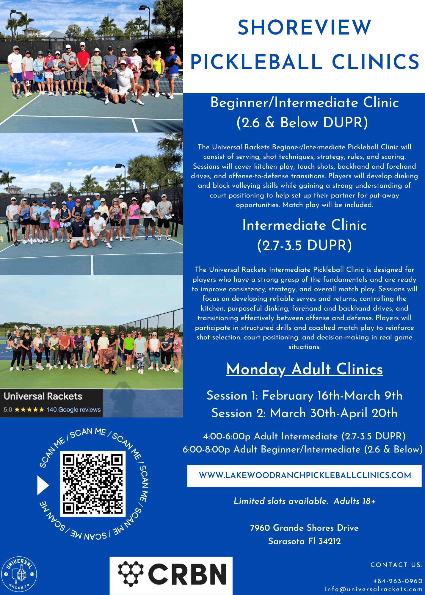 Session 2: MONDAY Adult Beginner/Intermediate (2.6 & Below DUPR) 6:00-8:00p (March 30th-April 20th) (Rain Date: April 27th)
