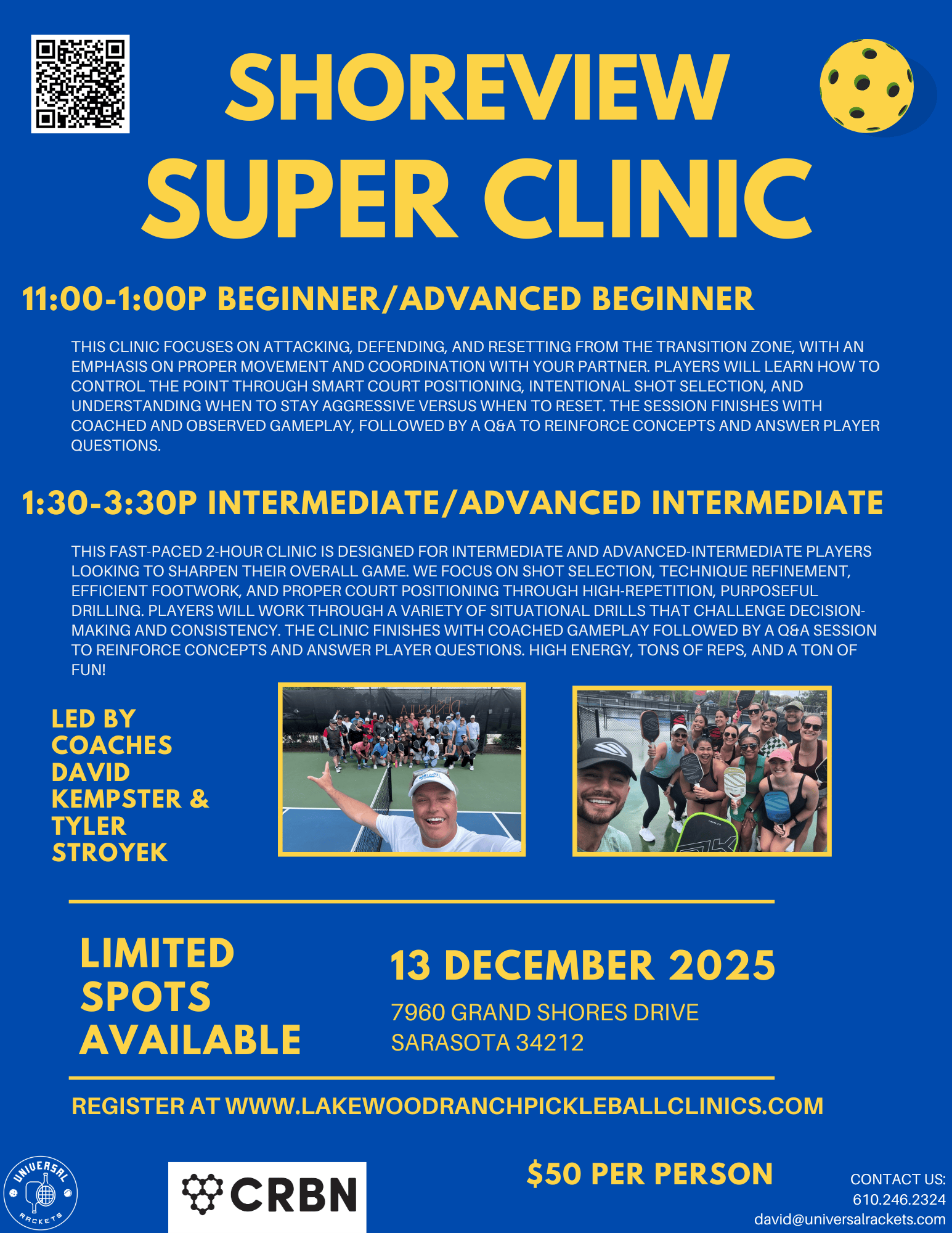 EMAIL DAVID@UNIVERSALRACKETS.COM IF YOU WOULD LIKE TO JOIN THE WAITLIST FOR THE 1:30-3:30P INTERMEDIATE/ADVANCED INTERMEDIATE CLINIC
